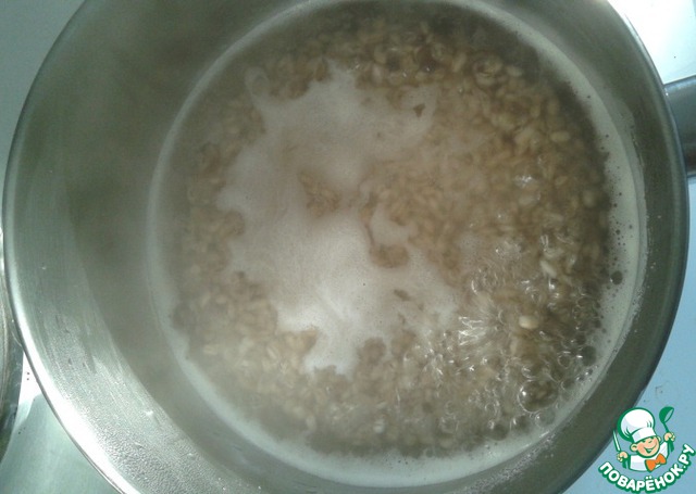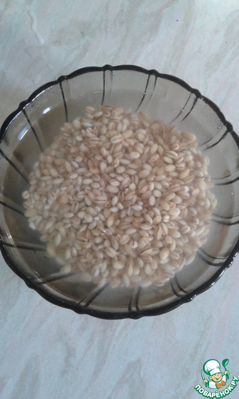 Перловку хорошо промыть и залить кипящей водой. Оставить набухать на 15 мин.