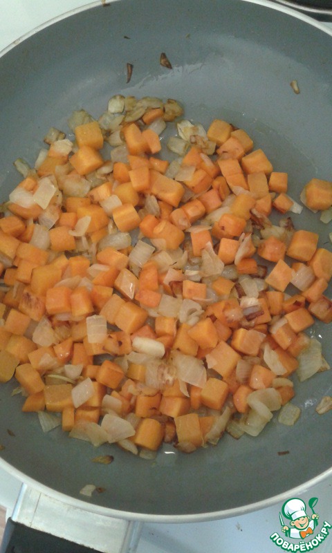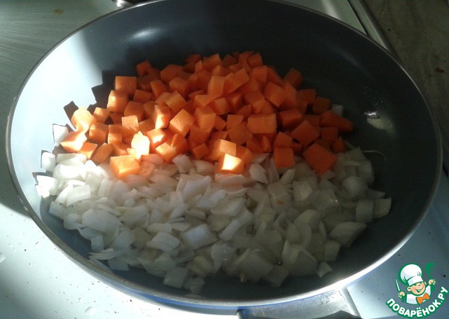 В сковородку выложить лук, чуть обжарить и добавить морковку.