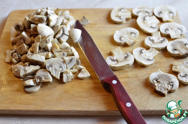 Грибы порезать кубиками, для подачи порезать грибы слайсами, как на фото.
