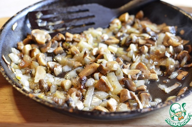 Шампиньоны которые порезали кубиками, обжарить на оливковом масле до полной готовности вместе с репчатым луком порезанным небольшими кубиками, слегка посолить и поперчить.
