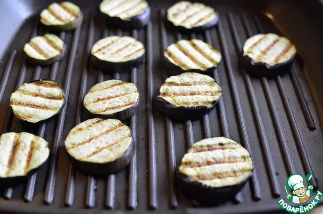 Пока каша еще горячая, выкладываем 3 столовых ложки каши, на кашу выкладываем грилованные баклажаны, и так несколько слоев. Подавать кашу только в остывшем виде. В холодильник убирать не обязательно, форму хорошо держит и без охлаждения в холодильнике!
