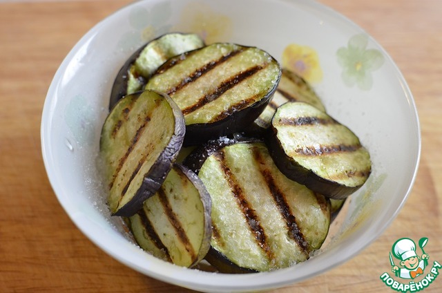 Грилованные баклажаны переложить в мисочку, посолить и полить оливковым маслом, оставить для маринования несколько минут.