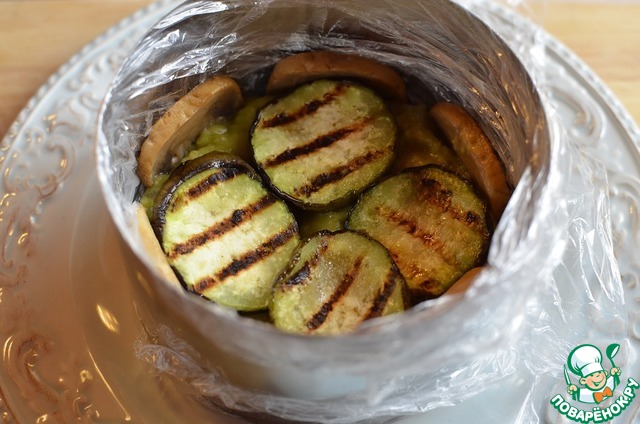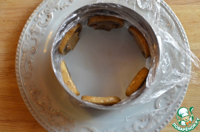 Решила и в это раз сделать необычную подачу, для гороховой каши. Для этого я взяла кулинарное сервировочное кольцо, для надежности обложила пищевой пленкой, этого можно не делать. Но я перестраховалась. В кольцо как на фото выложить обжаренные грибы.