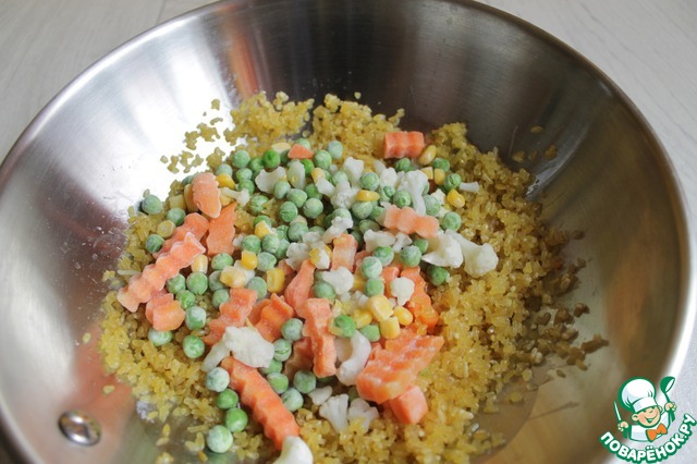 Итак нам пондаобится стакан крупы булгур. Стакан смеси замороженых овощей. У меня морковь, кукуруза, горох.