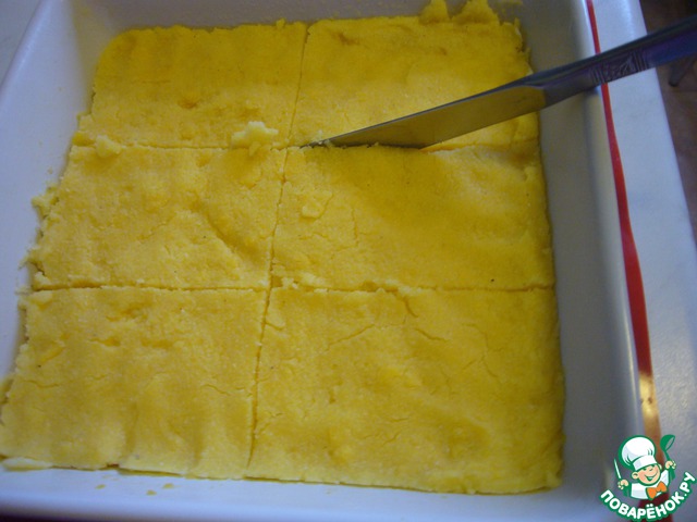 Выложить в форму поленту, слоем приблизительно 2 см, хорошо разровнять мокрой лопаточкой. И оставить остужаться, приблизительно на час.