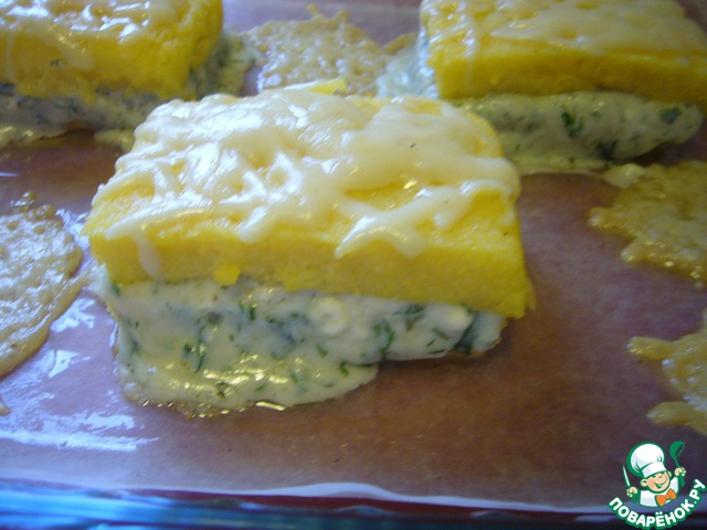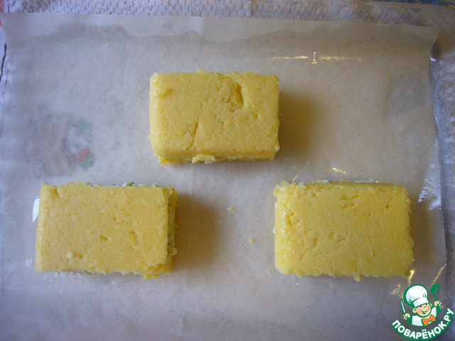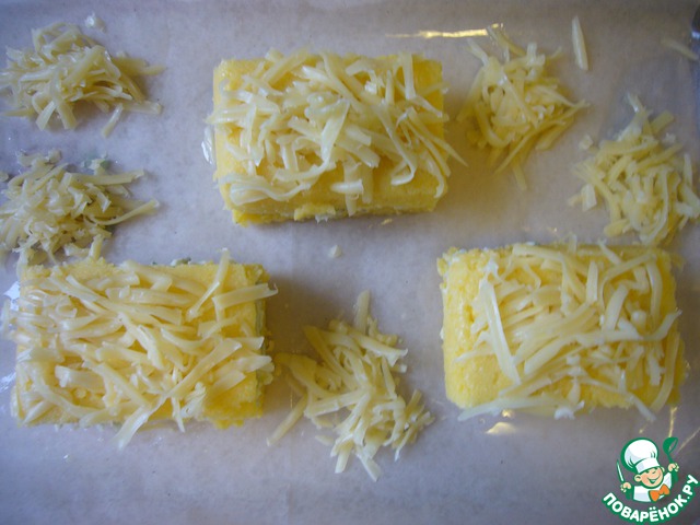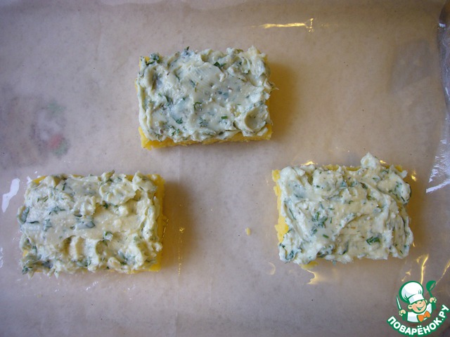 На противень накрытый пекарской бумагой выложить куски поленты. Смазать каждый кусок сырной массой.