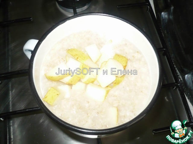 Как только каша закипает, то я сразу добавляю в нее порезанную грушу. Затем, накрываю кашу крышкой и оставляю томиться на медленном огне 20-25 мин. За это время груша становится мягкой и отдают свой сок в кашу.