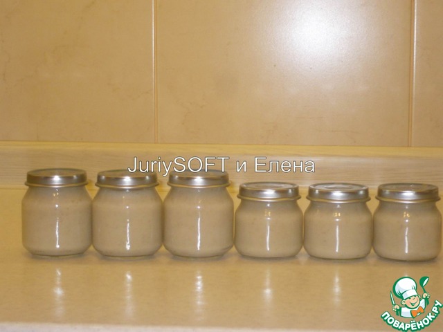 После стерилизации я начинаю раскладывать готовую кашу по баночкам. Саму кашу после блендера я не кипячу, т. к. делаю ее на 3 дня, посуда простерилизована, хранение происходит в основном отсеке холодильника на полке. Перед употреблением баночка подогревается в теплой воде и повторному хранению не подлежит.