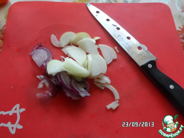 Лук репчатый и крымский порезать полукольцами и обжарить на растительном масле 2-3мин.