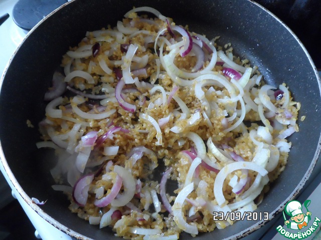 Добавить в луку булгур и обжарить все вместе 5 минут