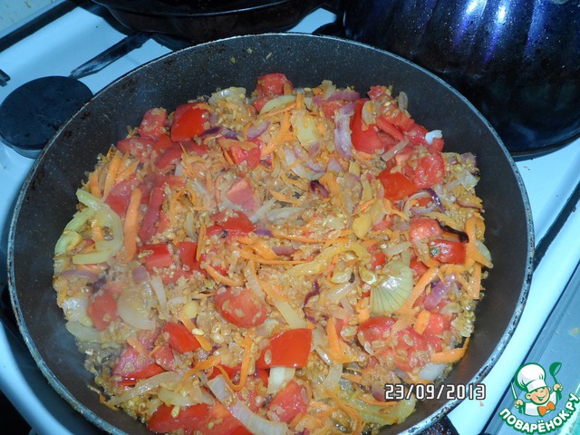 Потом добавить перец и тертую моркови и обжарить на среднем огне еще минут 2-3, затем добавить порезанные кубиками помидоры и все это притушить 5-7минут