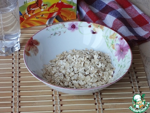 Отмерим овсяные хлопья. Я использую хлопья ТМ Мистраль, не требующие варки. Зальем их стаканом кипятка, перемешаем, накроем крышкой.