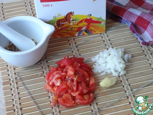 Тем временем очистим помидоры от кожицы (предварительно опустив их в кипяток, затем в холодную воду), нарежем кубиками, измельчим лук и корень имбиря (примерно 1 см). Имбирь можно пропустить через чесночный пресс. Истолчем в ступе орехи (не до пыли)))