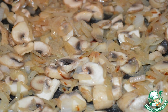 В сковороде разогреть масло и обжарить на нем лук до прозрачности. Затем добавить шампиньоны, перемешать и готовить на медленном огне.