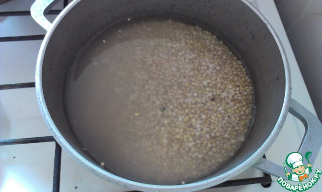 Промываем гречневую кашу, в этот раз у меня была зеленая, не обжаренная. Заливаем водой и ставим на средний огонь. Под крышкой.