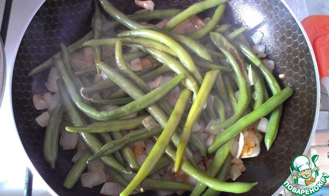 Когда лук немного подрумянится добавляем стручковую фасоль. Можно порезать, но мне нравится когда она длинная. Обжарисаем минут 5-8 на сильном огне, постоянно помешивая.