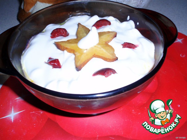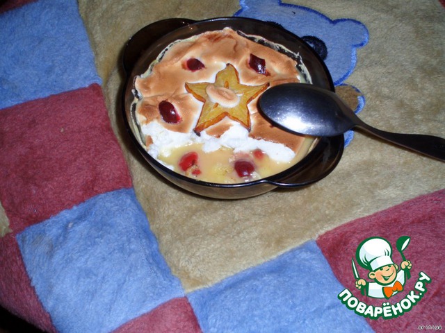 Взбитый белок тоже аккуратно выложить на кашу, украсить фруктами, ягодами. У меня был карамболь.