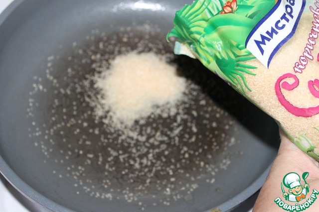 Апельсин филеровать и обжарить в коричневом сахаре в течение пары минут Сюда же выдавить апельсиновый сок, который остался в перепонках апельсинки
