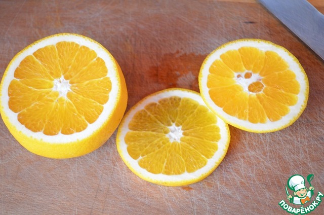 У апельсина срезать верхушку, так чтоб получилось чуть больше половины.