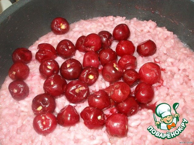 Добавляем в ризотто сахар, специи (корицу – на кончике ножа и немного ванили. Лучше всего, использовать ваниль натуральную, примерно половину стручка). Когда рис практически готов, выкладываем в него фаршированную орешками вишню, аккуратно перемешиваем и оставляем на огне еще на 2-3 минуты.