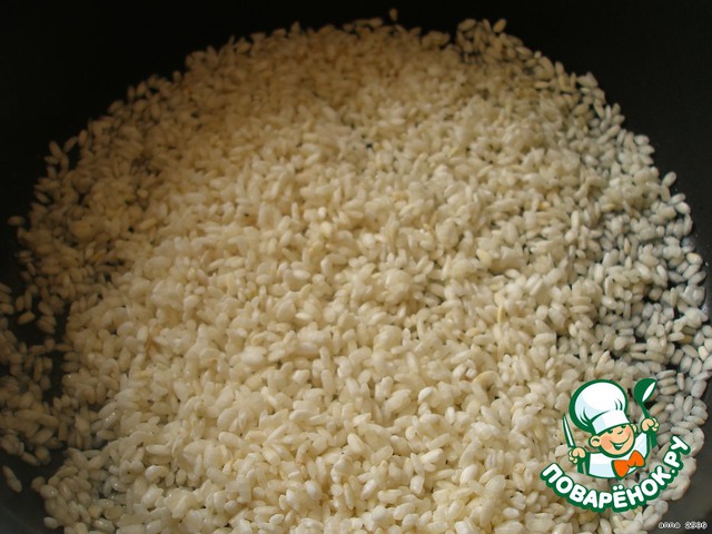 Рис нужно хорошо промыть, разогреть в сотейнике сливочное масло, добавить ложку оливкового и высыпать в сотейник подготовленный рис. Прогреть на небольшом огне 2 минуты.