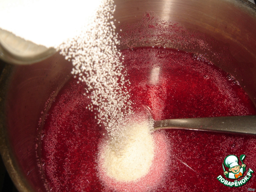 Отвар процедить, добавить клюквенный сок и всыпать тонкой струйкой манку, непрерывно помешивая.