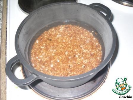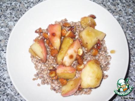 Гречку - на тарелку, яблоки-мёд-орешки - сверху.