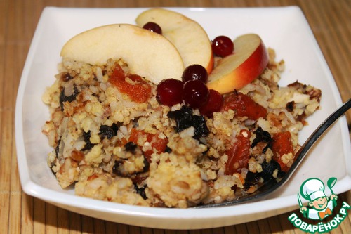 | Предлагаю приготовить кашу сборную из риса и пшена. В пост пища должна быть постной, но и поддерживать все необходимые потребности активного организма. В этом нам и поможет разнообразие блюд. А в этом варианте каши три в одном - вкусно, полезно, разнообразно. Например, пшено богато калием, который так необходим для сердца, рис содержит полезные аминокислоты для роста и развития организма, сложные углеводы для восполнения энергии, а изюм, курага и чернослив — витамины группы В, магний и железо. Орехи - полиненасыщенные жирные кислоты и белок |