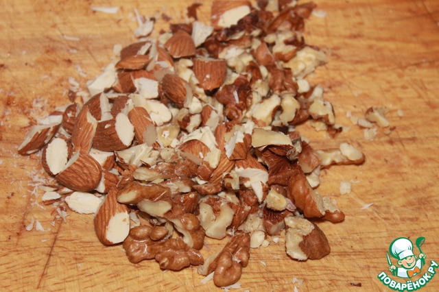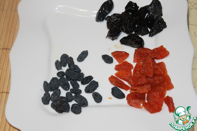 Изюм промываем, курагу и чернослив моем и режем на четвертинки