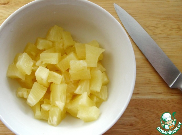 1. Ананас нарезать кубиками, отложить несколько штук для сервировки.