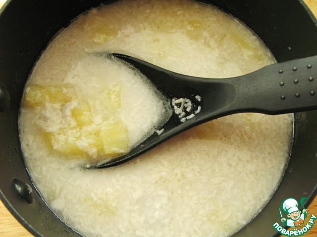 3. Добавить в кокосовое молоко ананас, горсть кокосовой стружки, посолить, добавить по вкусу сахар, перемешать, снова довести до кипения и снять с огня.