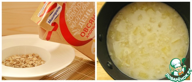 4. Насыпать овсяные хлопья в тарелку, залить их горячим кокосовым молоком, перемешать, накрыть и оставить завариваться на 3-5 минут.