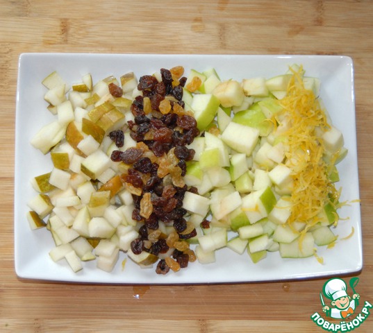 Изюм как следует промываем. Яблоко и грушу моем, нарезаем кубиками. Готовим цедру.