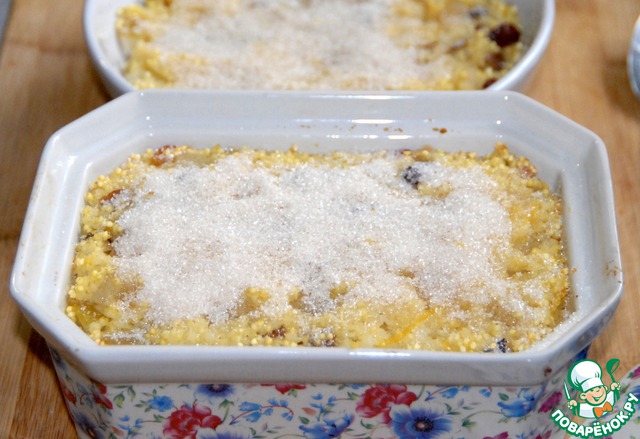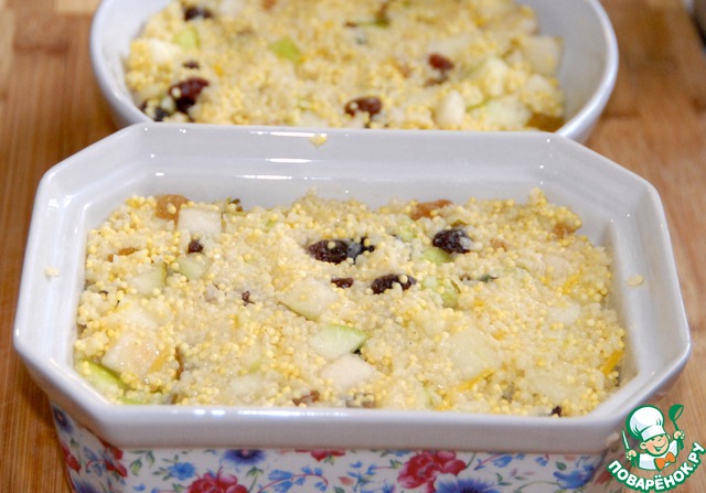 Перемешиваем пшено с фруктами, изюмом и цедрой, раскладываем по формам, накрываем крышкой или фольгой. Ставим в разогретую духовку на 30-40 минут.