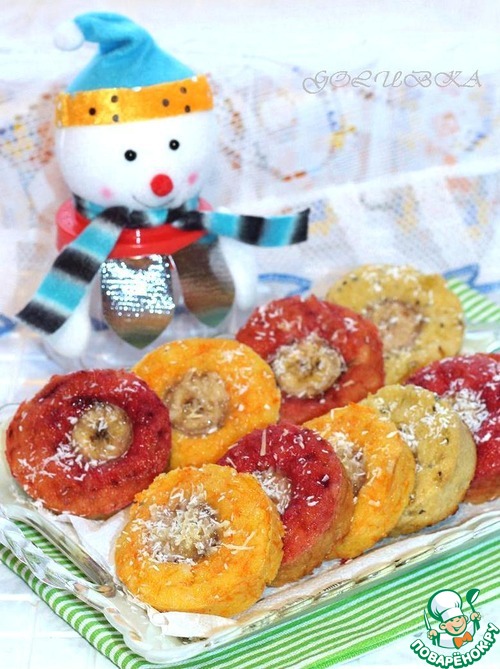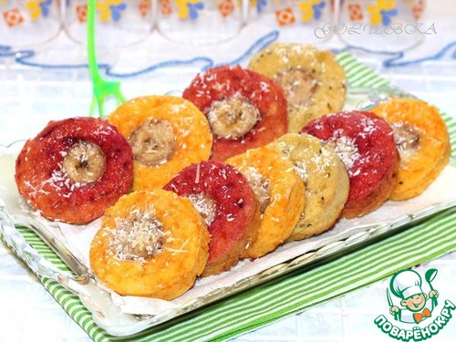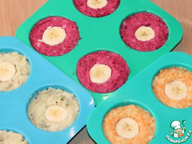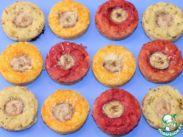 Сформовать из нее круглые или четырехугольные лепешки, смазать их маслом, посыпать оставшимся тертым сыром и запечь в духовке. Я положила тесто в силиконовые формочки, добавила по кусочку банана, посыпала немного сыром и поставила в хорошо разогретую до 180 С духовку на 30 минут.