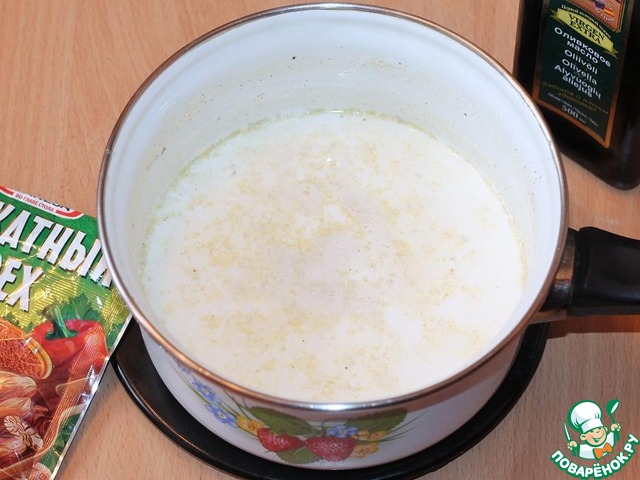 Молоко вскипятить с маслом (1 ст. л.) на тихом огне с небольшим количеством соли, сахаром и мускатным орехом.