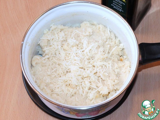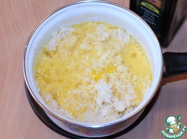 Снять кашу с огня и добавить 1 ст. л. оливкового масла, 2 ст. ложки тертого сыра и в последнюю очередь взбитые яйца (чтобы не свернулись). Хорошо перемешать. Разделить кашу на 3 части.