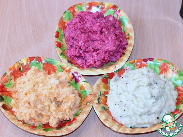 Натереть на терке маленькую свеклу, небольшую морковь, киви и разложить в разные миски. Добавить по 1/3 части каши в каждую миску и перемешать. Масса должна быть густой, поэтому больше 3 ст. л. тертой смеси в кашу не добавлять)))