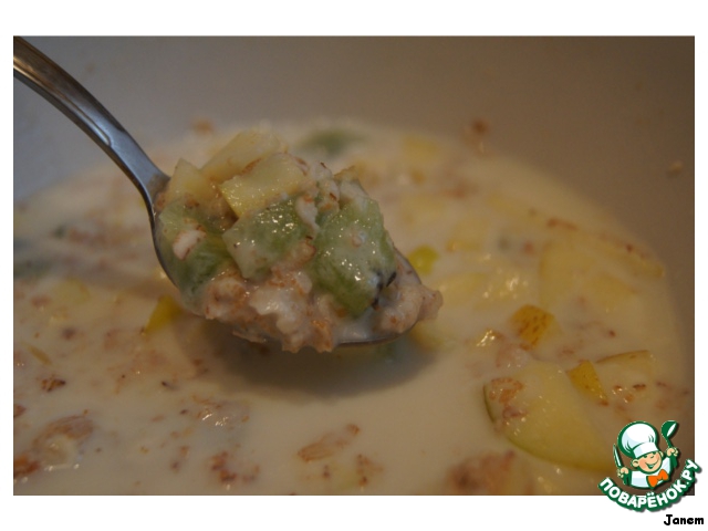 Возвращаемся к овсяным хлопьям. Они достаточно набухли и готовы к употреблению. Добавляем нарезанные фрукты, перемешиваем.