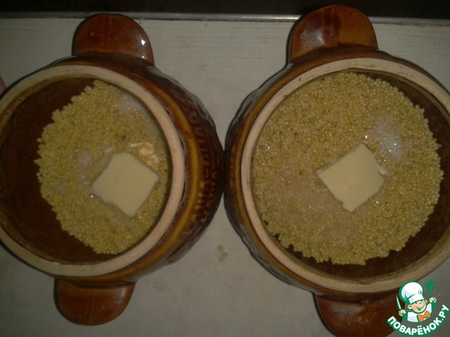 Промываем пшено и выкладываем его в горшочки. Сверху выкладываем по кусочку масла. Солим и добавляем по 2 чайные ложки сахара.