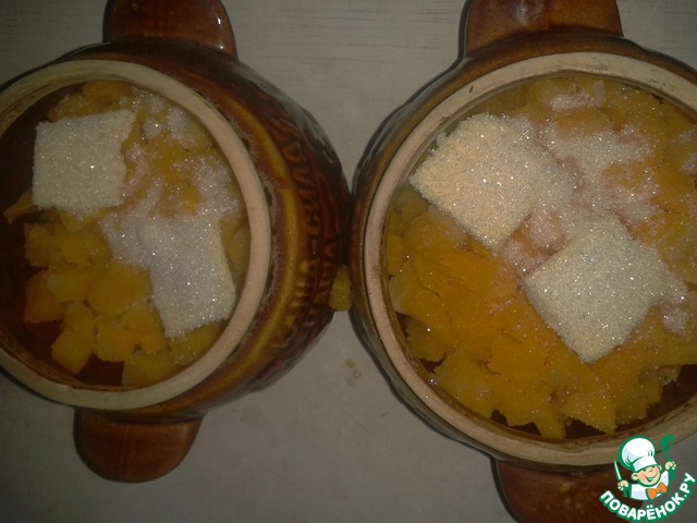 Сверху выкладываем тыкву, еще немного масла и по две чайные ложки сахара, но уже без соли. Заливам горячей водой на одну фалангу указательного пальца выше тыквы. Ставим в духовку на 1 час при температуре 250 градусов.