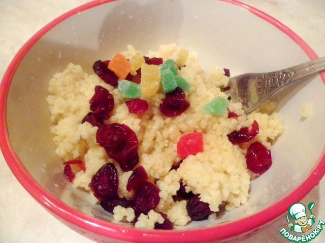 Смешать готовое пшено с сушеной клюквой и цукатами, добавить мед по вкусу и перемешать.
