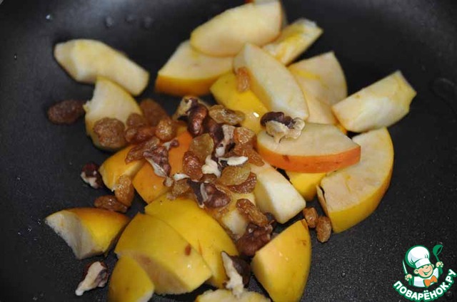 В сотейник кладём яблоки, помытый изюм и поломанные грецкие орехи.