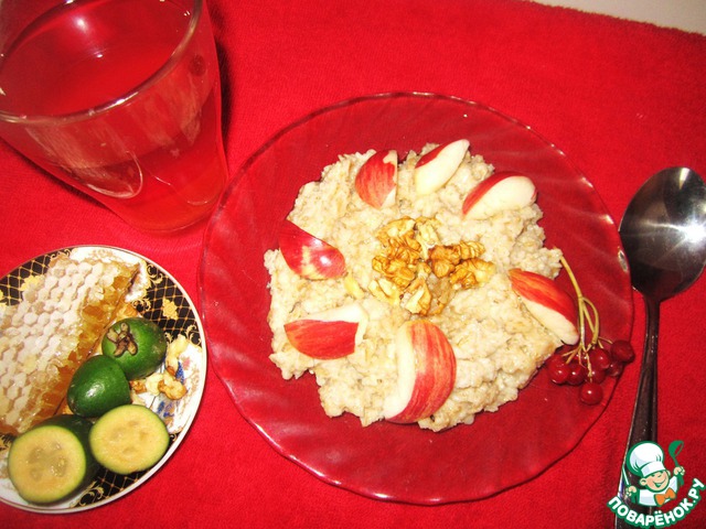 Нарезать яблоки, добавить в кашу мёд, орехи, яблоки по вкусу.