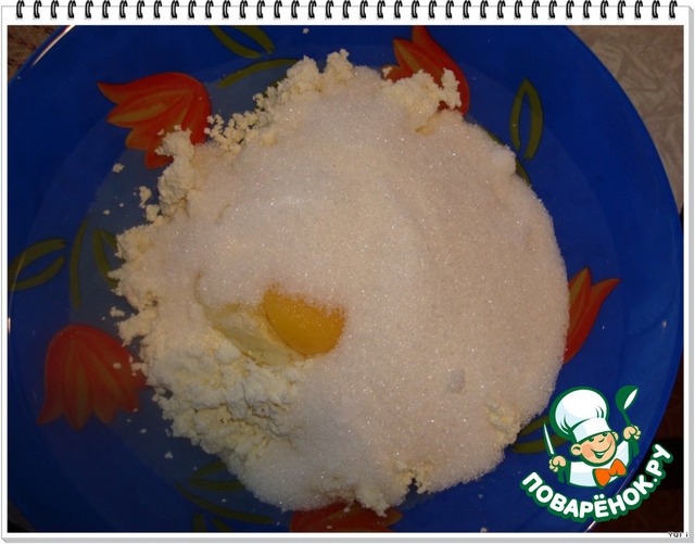 Всё размешать до однородной массы.Добавить 0,5 стакана сахара.Масса должна получиться рассыпчатой и не прилипать к рукам.Тесто готово!