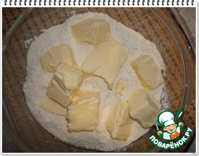Готовим тесто:маргарин,предварительно размороженный,порезать на кусочки и добавить в муку,туда же положить соду.