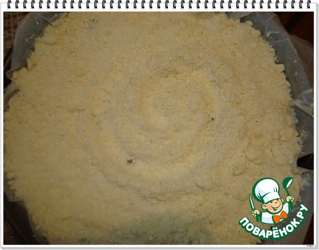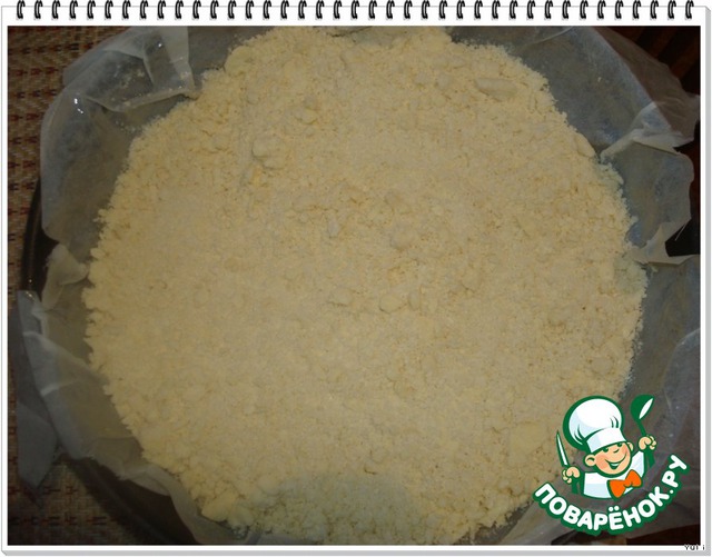 На форму,смазанную растительным маслом положить лист бумаги для выпечки.На него высыпать больше половины нашего теста(чуть-чуть оставить для верхней посыпки).