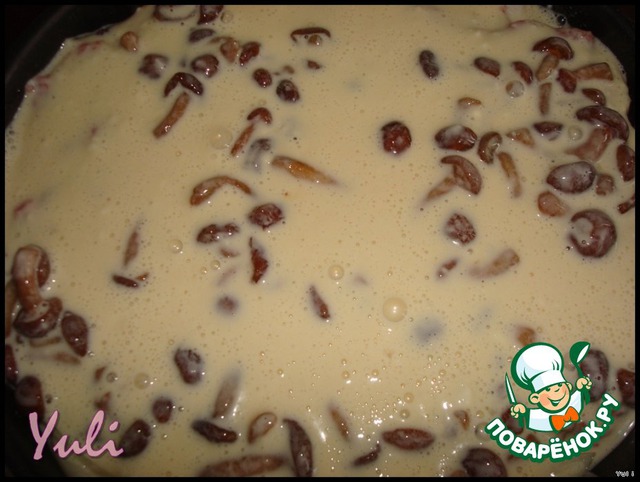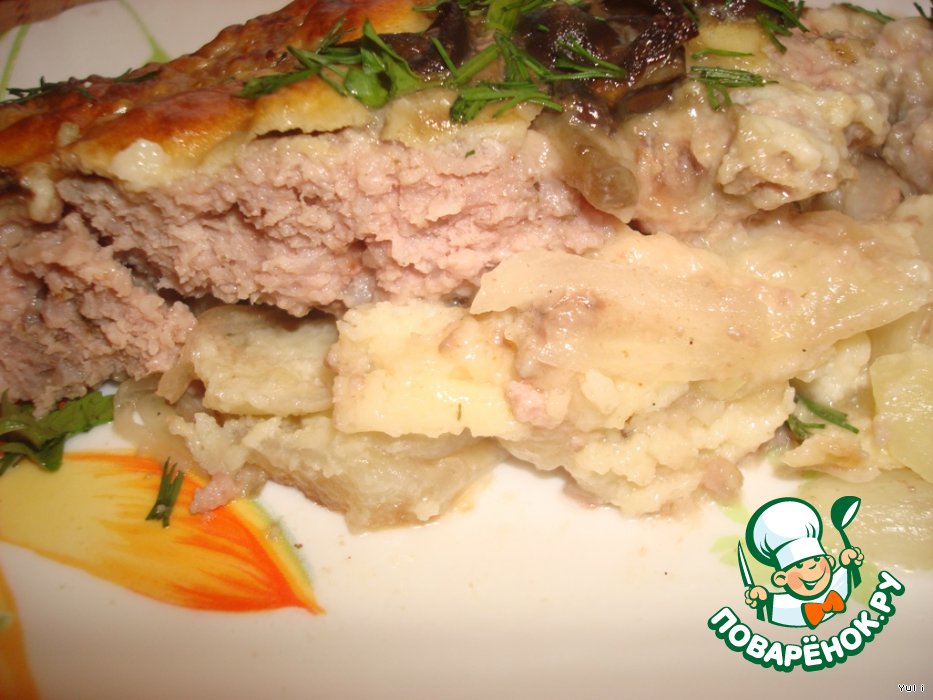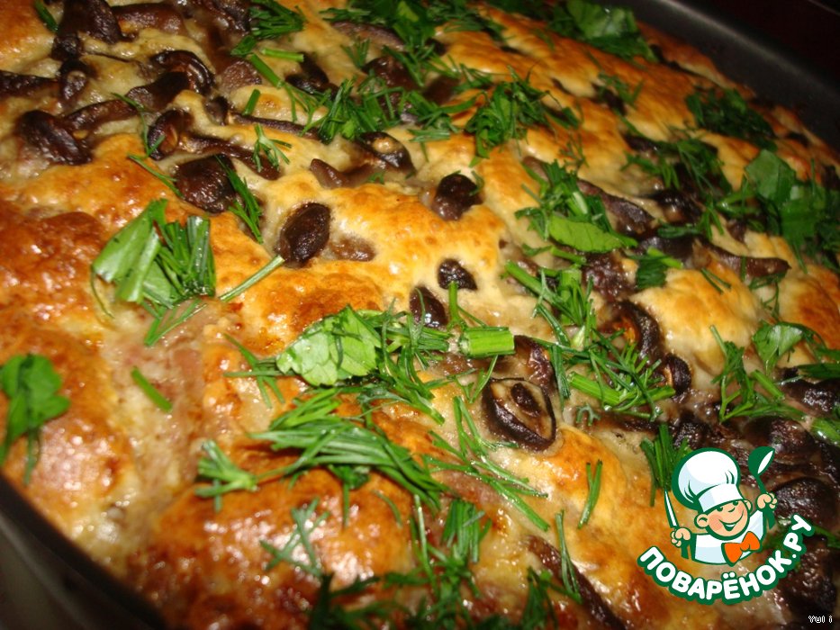 Наверх укладываем мясной фарш и грибы.У меня замороженные опята.Можно обойтись и без грибов или,наоборот,сделать только грибную запеканку без фарша.