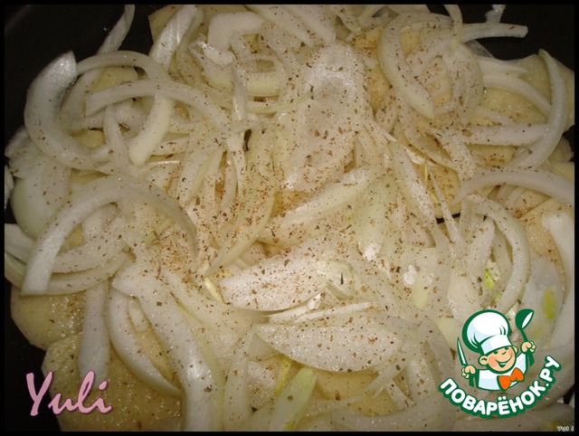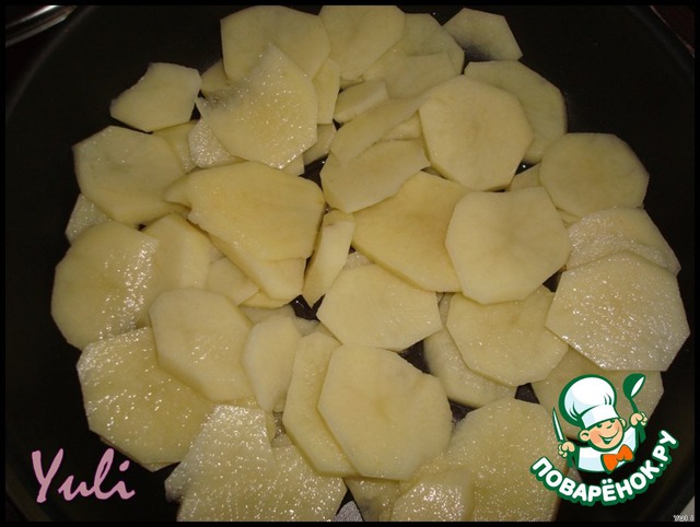 Форму смазать растительным маслом,порезать сырую картошку тоненькими кружочками,посолить.