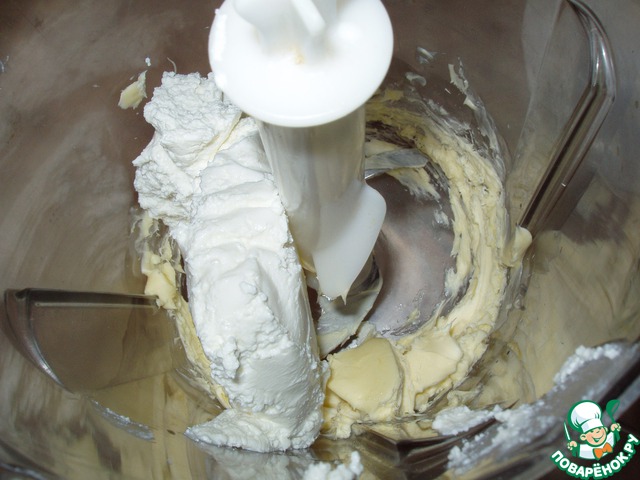 В блендер или комбайн положить размягчённое масло и взбить добела. Добавить творог. Ещё раз взбить.